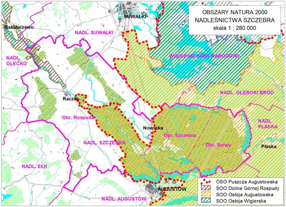Obszar Puszczy Augustowskiej i Ostoi Augustowskiej na większości powierzchni pokrywają się terytorialnie. Powyższa mapa przedstawia granice obszarów Natura 2000 względem zasięgu nadleśnictwa. Poniższe opisy dotyczą całych obszarów Natura 2000 a nie części w granicach nadleśnictwa.